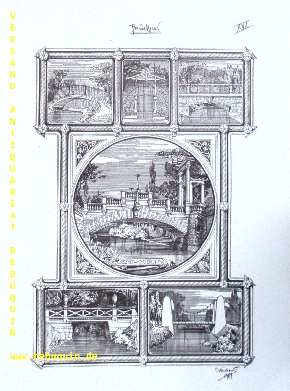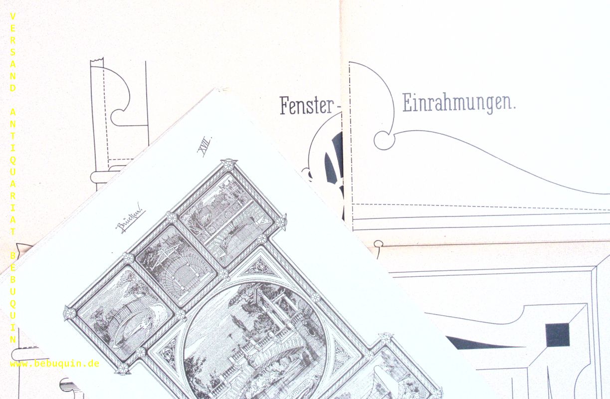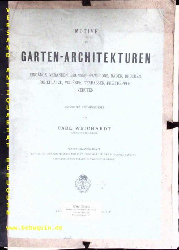 ARCHITEKTUR.– WEICHARDT, Carl: Motive zu Garten-Architekturen. Eingänge, Veranden, Brunnen, Pavillons, Bäder, Brücken, Ruheplätze, Volièren, Terrassen, Freitreppen, Veduten etc. Weimar (Voigt), 1879. 2°. Titel auf 2 Bl., XXIV (von XXV) Zinkographien im Simplexdruck enthaltend zwanzig Projekte und etwa einhundert Skizzen in Randzeichnungen, 10 mehrfach gefaltete Blätter nebst drei Bogen Details in natürlicher Größe. OHLnMappe. Mappe stärker bestaubt, innen nur an den Rändern bestaubt, es fehlt die 1. Tafel mit den „Garteneingängen“. Sehr seltenes und dekoratives Dokument aus der Boomzeit nach dem Deutsch-Französischen Krieg als die eklektische Gartenarchitektur sich frei aller Stilelemente der Klassik und der Renaissance bediente um den Reichtum der Gartenbesitzer prunkvoll zur Schau zu stellen.