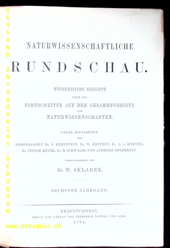 NATURKUNDE.– SKLAREK, W.: (Hrsg.) Naturwissenschaftliche Rundschau. Unter Mitwirkung von Bernstein, Ebstein, Koenen, Schwalbe u.a. 6. Jahrgang. Braunschweig (Vieweg), 1891. 4°. 680 S. OHLdr. Kanten und Rücken berieben, Vortitelseite etwas lädiert, sonst durchaus ordentlich. EA.