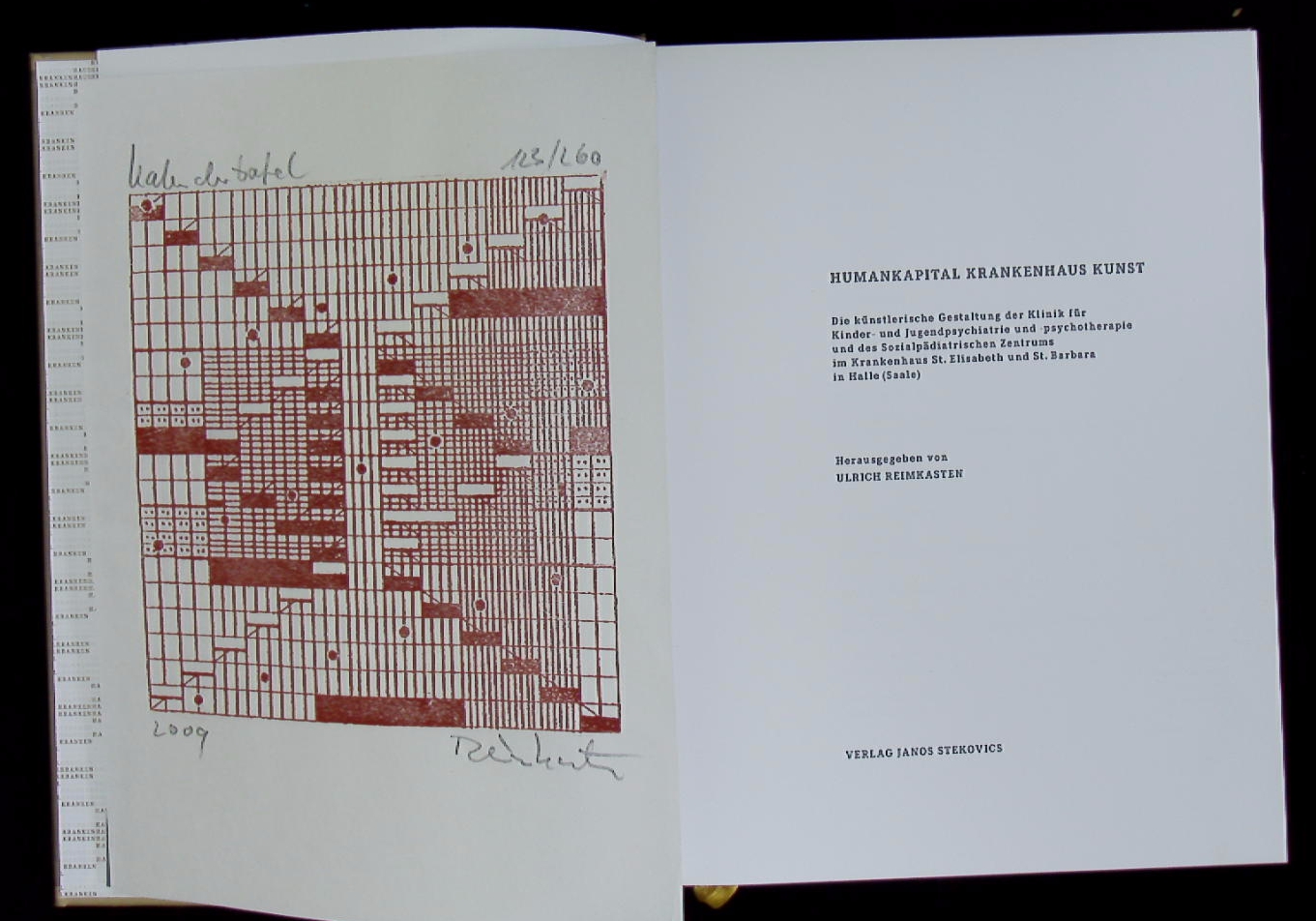 REIMKASTEN, Ulrich: Humankapital Krankenhaus Kunst. Die künstlerische Gestaltung der Klinik für Kinder- und Jugendpsychiatrie und -psychotherapie und des Sozialpädiatrischen Zentrums im Krankenhaus St. Elisabeth und St. Barbara in Halle (Saale). Wettin OT Dössel (Stekovics), 2009. 4°. 272 S. mitb zahlr. farb. Bildtafeln. ill. OPb. tadellos. = Schriftenreihe Burg Giebichenstein, Hochschule für Kunst und Design Halle, 21. Nr. 123 von 260 Ex. der EA mit einer eigenhändig nummerierten, signierten und bezeichneten Bildtafel beiliegend.