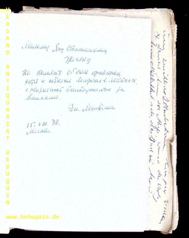 EA des nie in einer deutschen Übersetzung erschienenen Rettungsberichts der verunglückten Nobileexpedition. Mindlin, der als Journalist det Schiffsbesatzung an gehörte, schildert die begebenheiten jenes Sommers 1928. Darin eine eigenhändige ausführliche Widmung des Verfassers sowie umfangreiches Privatmaterial zur Verlagsgeschichte.