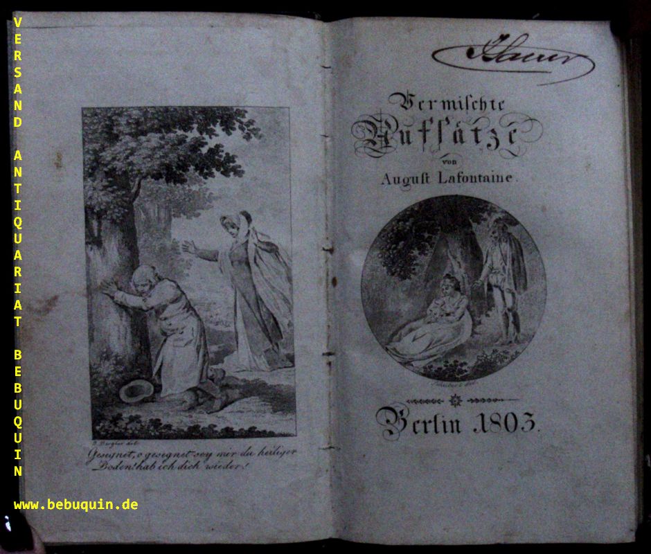 LAFONTAINE, August: Vermischte Aufsätze. Berlin [i.e. Wien], Haas, 1803. kl. 8°. 270 S. mit gest. Titelkupfer u. gest. Titel mit Vignette. PB der Zeit mit goldgeprägtem Rücken. NaV, vereinzelt wasserrandig, gutes Ex. EA. Kosch IX, 803; ADB XVI, 512 u. NDB XIII, 406.
