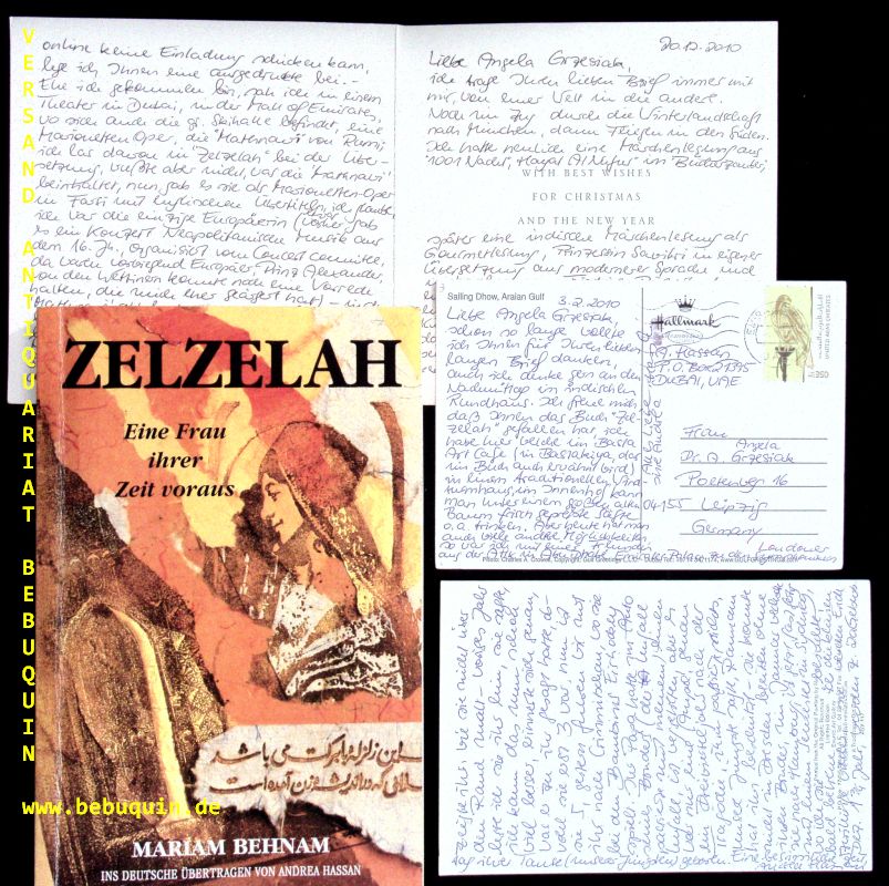 HASSAN.– BAHNAM, Mariam: Zelzelah. Eine Frau ihrer Zeit voraus. D.v. Andrea Hassan. Offenburg (Samira), 1998. Gr. 8°. 264 Seiten, 4 ungezählte Blätter Bildtafeln Illustrationen, Diagramme, Karten. farb. ill. OKart. gutes Ex. dt. EA mit einer umfangs- und inhaltsreichen eigenhändigen Korrespondenz der Übersetzerin beiliegend.