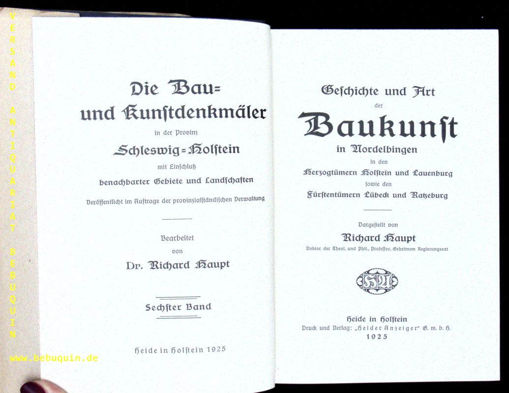 SCHLESWIG-HOLSTEIN.– HAUPT, Richard: Geschichte und Art der Baukunst in Nordelbingen in den Herzogtümern Holstein und Lauenburg sowie den Fürstentümern Lübeck und Ratzeburg. Heide (Anzeiger), 1925. [10] Bl., 776, 40 S. mit 1000 Ill., graph. Darst. und Karten. OLn mit OUmschl. tadellos. = Die Bau- und Kunstdenkmäler in der Provinz Schleswig- Holstein, Bd. 6. EA.