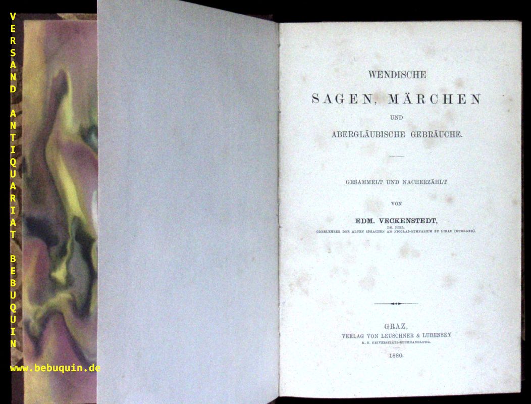 LAUSITZ.– VECKENSTEDT, Edmund: Wendische Sagen, Märchen und abergläubische Gebräuche. Graz (Leuschner u. Lubensky), 1880. XIX, 499 S. HLn der Zeit mit goldgeprägtem Rücken . kleiner Wurmgang, sonst gut erhalten. EA. Edmund Veckenstedt (* 7. Januar 1840 in Vehlitz; † 7. Februar 1903) war ein deutscher Pädagoge, Historiker, Ethnologe und Autor. (Wikipedia)