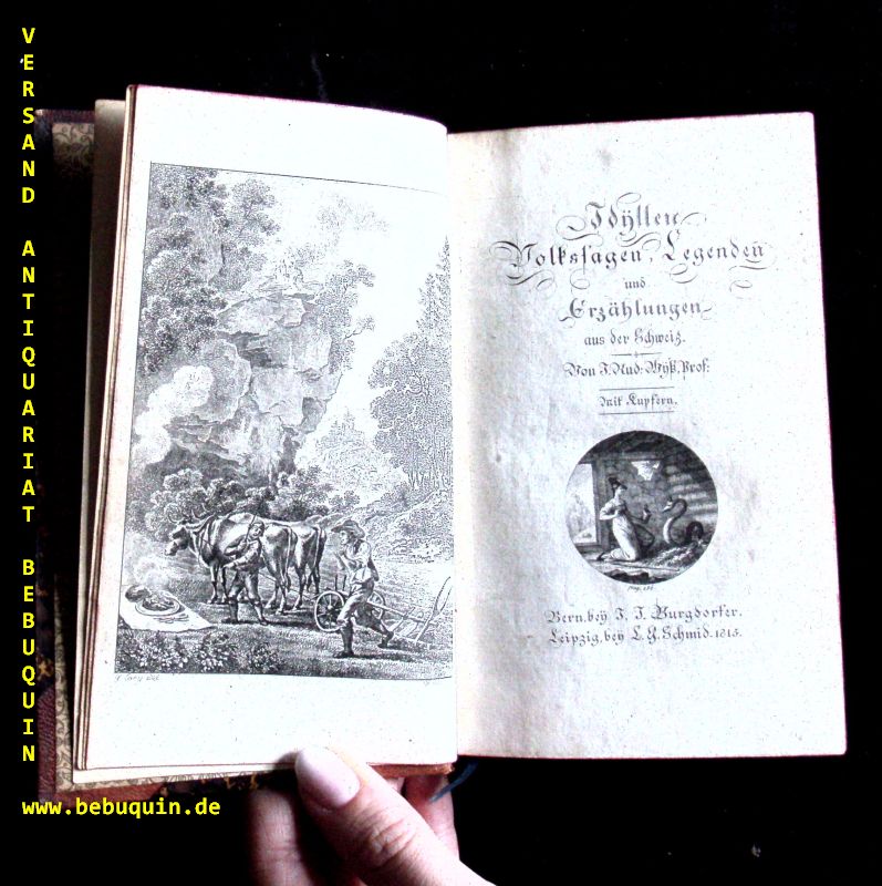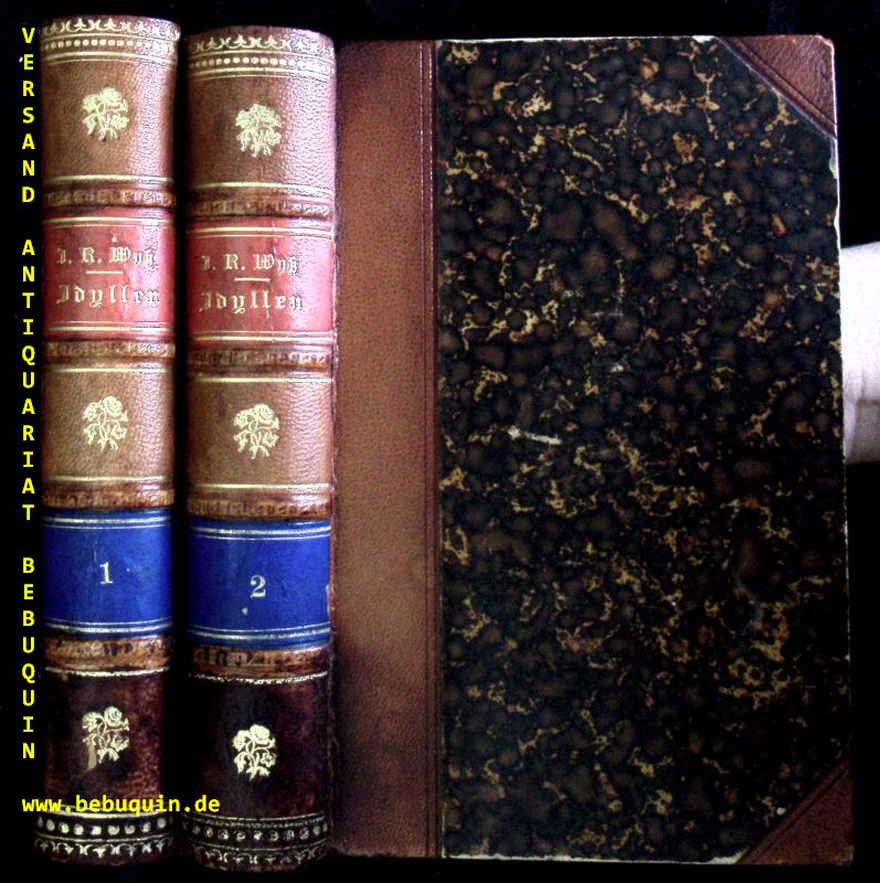 SCHWEIZ.– WYSS, Johann Rudolf: Idÿllen, Volkssagen, Legenden und Erzählungen aus der Schweiz. 2 Bän de. Bern (Burgdorfer), 1815 / 1822. kl. 8°. XIV, 336, VIII, 416 S. mit 2 Frontispizen, 2 Titelvignetten und 5 (von 6) Tafeln im Kupferstich sowie dreiseitigem Rotschnitt. Hldr der Zeit mit 2 farb. Lederrpückenschildern. Kanten etwas berieben, leider fehlt das Kupfer zu I / 97, sonst von feiner Erhaltung.