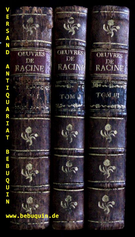 RACINE, Jean: Oeuvres. Avec Figures. Nouvelle Edition. 3 Bände. Amsterdam (Arkstee & Merkus), 1771. 12°. XLII S., 5 Bl., 376 S. 11 Bl., 340 S., 10 Bl., 366 S. mit einigen Kupfertafeln. HLdr der Zeit mit goldgeprägten Rückenschildern, marmorierten Vorsätzen und dreiseitigem Rotschnitt. Kanten etwas berieben, insgesamt gut.
