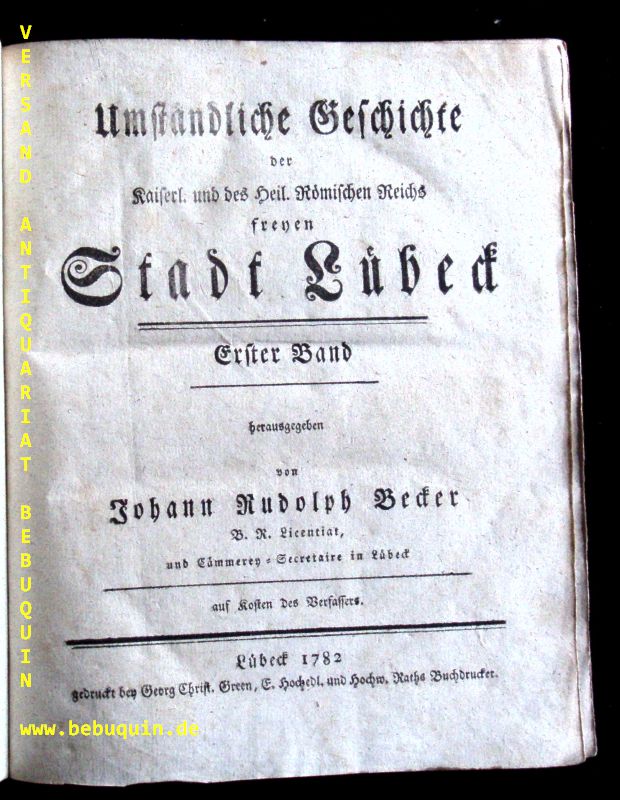 LÜBECK.– BECKER, Johann Rudolph: (Hrsg.) Umständliche Geschichte der Kaiserl. und des Heil. Römischen Reichs freyen Stadt Lübeck. 1. Bd. (von 3). Lübeck (Green), 1782. 4°. 4 Bl., 472 (von 524) S. mit einigem Buchschmuck aber ohne die Lübeckansicht. späterer Pb. die sibente Abzeilung ist unkomplett, sonst gutes Ex. EA des ersten Bandes der Lübeckischen Geschichte.