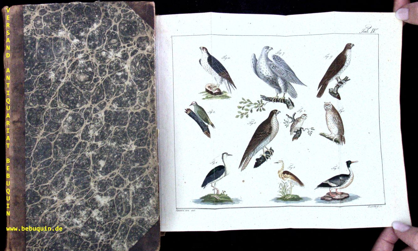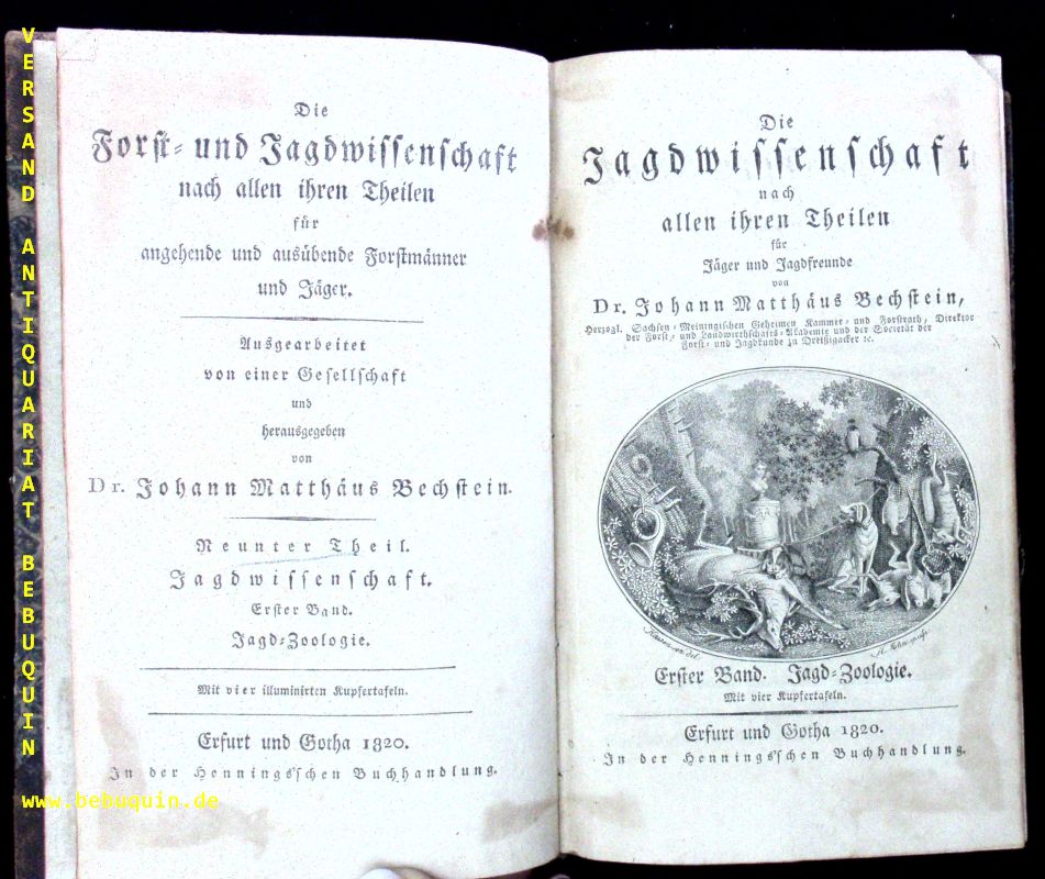 JAGD.– BECHSTEIN, Johann Matthäus: Jagd-Zoologie. Die Jagdwissenschaft nach allen ihren Theilen für Jäger und Jagdfreunde. Bd. 1. Gotha/Erfurt (Hennings), 1820. XXIV S., 967 (13) S.+ 4 illuminirte gefaltete Kupfertafeln sowie dreiseitiger Rotschnitt. Hldr der Zeit mit goldgeprägtem Rücken. Vorsätze teils gebräunt, sonst sehr feines Ex. = Die Forst- und Jagdwissenschaft nach allen ihren Theilen für angehende und ausübende Forstmänner und Jäger. Ausgearbeitet von einer Gesellschaft und ehemals herausgegeben von Dr. Johann Matthäus Bechstein, Theil 9. EA. Johann Matthäus Bechstein (* 11. Juli 1757 in Waltershausen; † 23. Februar 1822 in Dreißigacker bei Meiningen) war ein deutscher Naturforscher, Forstwissenschaftler und Ornithologe. Er gilt als Pionier des Naturschutzes und der wissenschaftlichen Ornithologie. (Wikipedia)