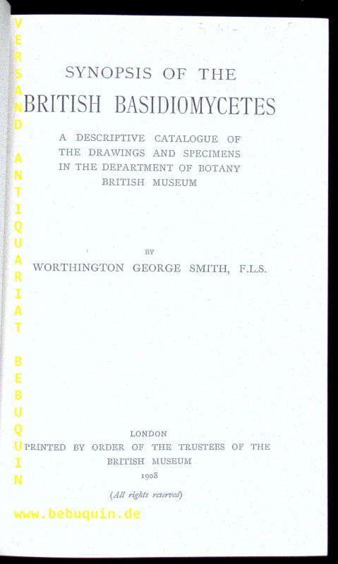 PILZE.– SMITH, Worthington George: Synopsis of the British Basidiomycetes. A descriptive catalogue of the drawings and specimens in the department of botany, British Museum. London (Trustees of the British Museum), 1908. 531 S. mit 145 Abb. OLn mit goldgeprägtem Rücken. gutes Ex. EA,