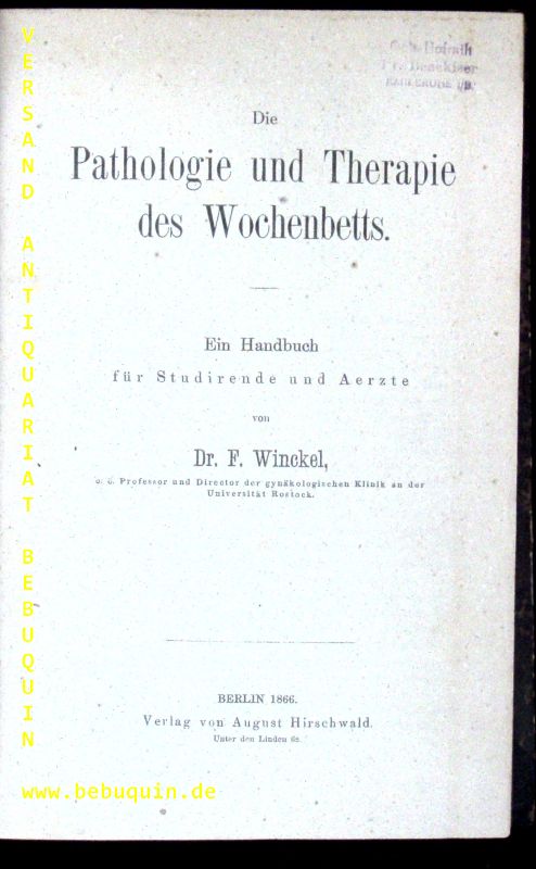 MEDIZIN.– WINCKEL, F.: Die Pathologie und Therapie des Wochenbetts. Ein Handbuch für Studirende und Ärzte. Berlin (Hirschwald), 1866. IX, 436 S. HLdr der Zeit mit goldgeprägtem Rücken. Rücken einseitig abgeplatzt, NaV, NaT. EA. Franz Wilhelm Carl Ludwig Winckel, ab 1891 Ritter von Winckel (* 5. Juni 1837 in Berleburg; † 31. Dezember 1911 in München) war ein deutscher Gynäkologe und Geburtshelfer. Er prägte 1909 das Wort „Frauenkunde“. (Wikipedia)