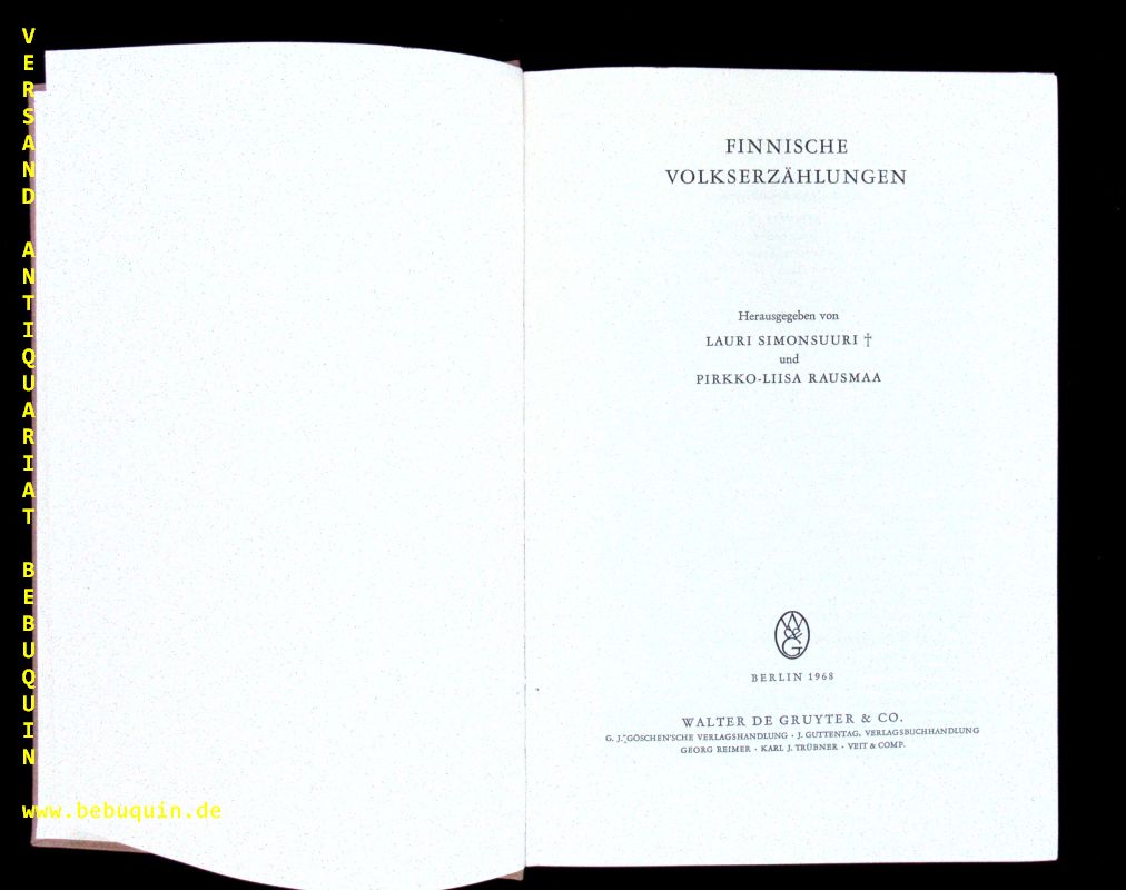 FINNLAND.– SIMONSUURI, Lauri + RAUSMAA, Pirkko-Liisa: (Hrsg.) Finnische Volkserzählungen. Berlin (de Gruyter), 1968. Gr. 8°. XIX, 362 S. Kt. OLn. feines Ex. = Fabula; Supplement-Serie, Reihe A, 7. EA.