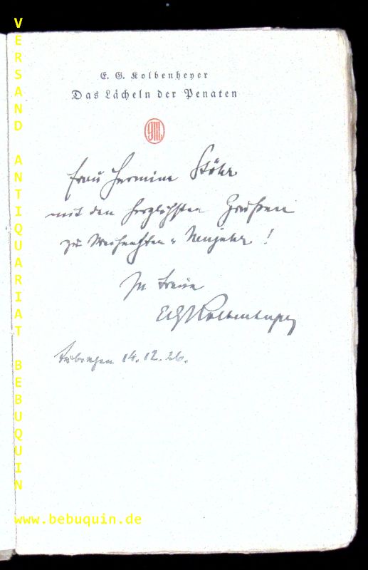 KOLBENHEYER, E.G.: Das Lächeln der Penaten. München (Georg Müller), 1927. 268 S. OBr. Kanten unbeschnitten. EA WG² 18. Mit einer 6zeiligen eigenhändigen voll signierten und datierten Verfasserwidmung auf Vortitel.