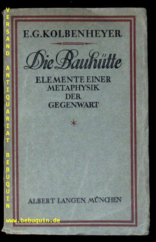 KOLBENHEYER, E.G.: Die Bauhütte. Elemente einer Metaphysik der Gegenwart. München (Albert Langen), 1925 501 (1) S. OBr. Kanten unbeschnitten. EA WG² 15. Mit einer 5zeiligen eigenhändigen voll signierten und datierten Verfasserwidmung auf Vortitel.