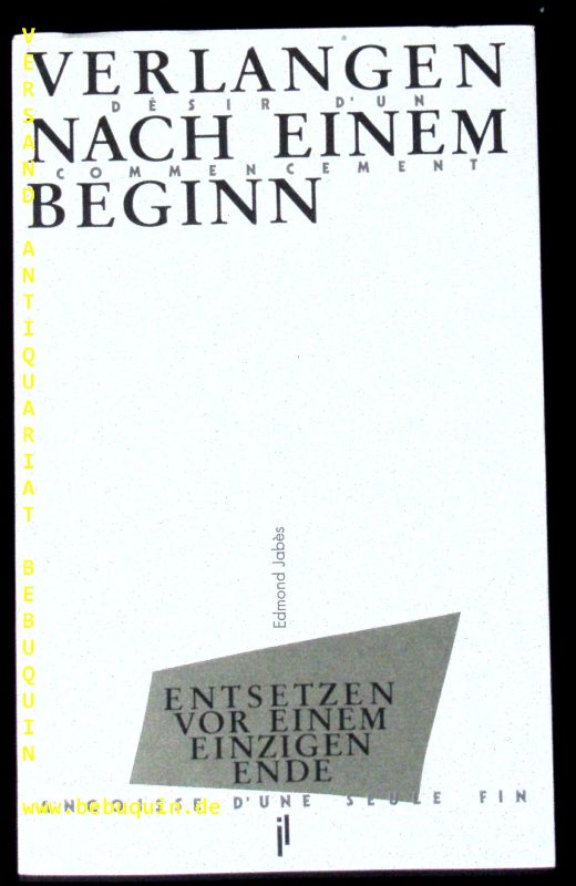 JABES, Edmond: Verlangen nach einem Beginn, Entsetzen vor einem einzigen Ende. Französisch und Deutsch. Stuttgart (Legueil), 1992. Gr. 8°. 91 (2) S. mit 2 Zeichnungen von Matthias Kohlmann. ill. OKart. gutes Ex. EA.