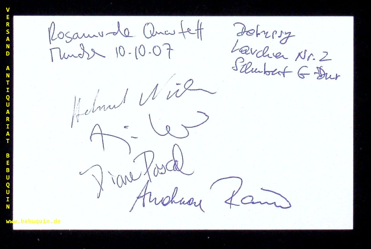 ROSAMUNDE QUARTETT.– REINER, Andres + PASCAL, Diane + NICOLAI, Helmut + LECHNER, Anja: eigenhändig von allen signierte und datierten Autogrammkarte. München (Herkulessaal), 10.10.2007. Karteikarte. Das Rosamunde Quartett war ein 1992 gegründetes deutsches Streichquartett, das bis 2009 bestand. Der Name des Ensembles geht auf Franz Schuberts Streichquartett Nr. 13 „Rosamunde“ zurück. (Wikipedia)