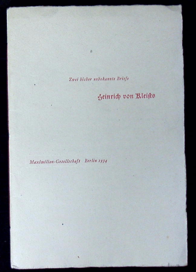 KLEIST, Heinrich von: Zwei bisher unbekannte Briefe Heinrich von Kleists. Hrsg. von Herbert Wünsch. Berlin (Maximilian-Ges.), 1934. Gr. 8°. 24 Bl. OKart mit Fadenbindung. kaum gebräunt. = Jahresgabe für die Mitglieder der Maximilian-Gesellschaft, 1934. Nr. 61 von 300 numerierten Ex.