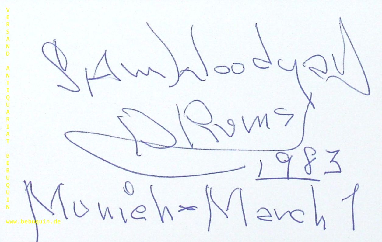 JAZZ.– WOODYARD, Sam (Schlagzeuger): eigenhändig signierte und datierte Autogrammkarte. München, 3.1.1983. 8 x 12,5 cm. Karteikarte. Samuel „Sam“ Woodyard (* 7. Januar 1925 in Elizabeth (New Jersey); † 20. September 1988 in Paris) war ein US-amerikanischer Jazz-Schlagzeuger, der das Spiel auf zwei Basstrommeln populär machte. (Wikipedia)