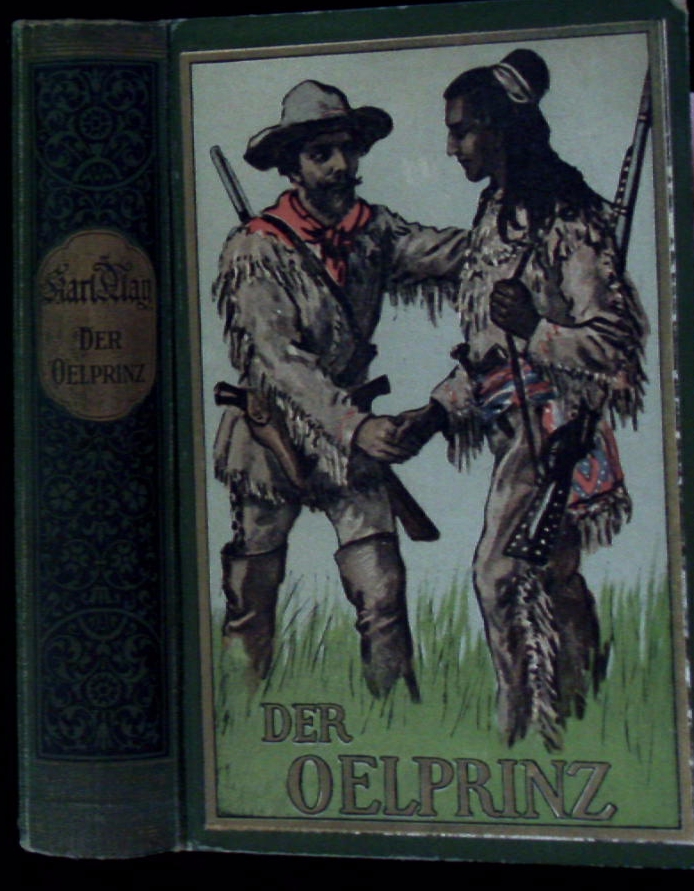 MAY, Karl: Der Ölprinz. 16.– 22. Tsd. Radebeul (Karl May), (1917). 608 (4) S. farb. ill. OHLn. (DB 72a). gutes Ex. mit farbstarkem Einband. Rücken gebräunt, Name auf Innendeckel, NaV, Gelenke etwas gelockert = Gesammelte Werke, Band 37. Sehr rare erste Auflage in Radebeul in der Version T2 mit der Tausender Angabe auf Titelseite, dem Z XIX Stempel auf der Titelseite und dem extrem raren Halbleineneinband. Hermesmeier / Schmatz GW 37.6.