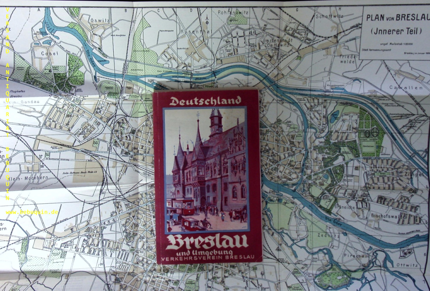 OSTEGEBIETE.– HALLAMA, Georg: (Bearb.) Breslau und Umgebung. Breslau (Verkehrsverein), 1929. 156 S. mit zahlr. Abb, 1 Grundriss und 1 farb. Stadtplan. farb. ill. OKart. Verleimung etwas gelockert, sonst sehr gut erhalten.