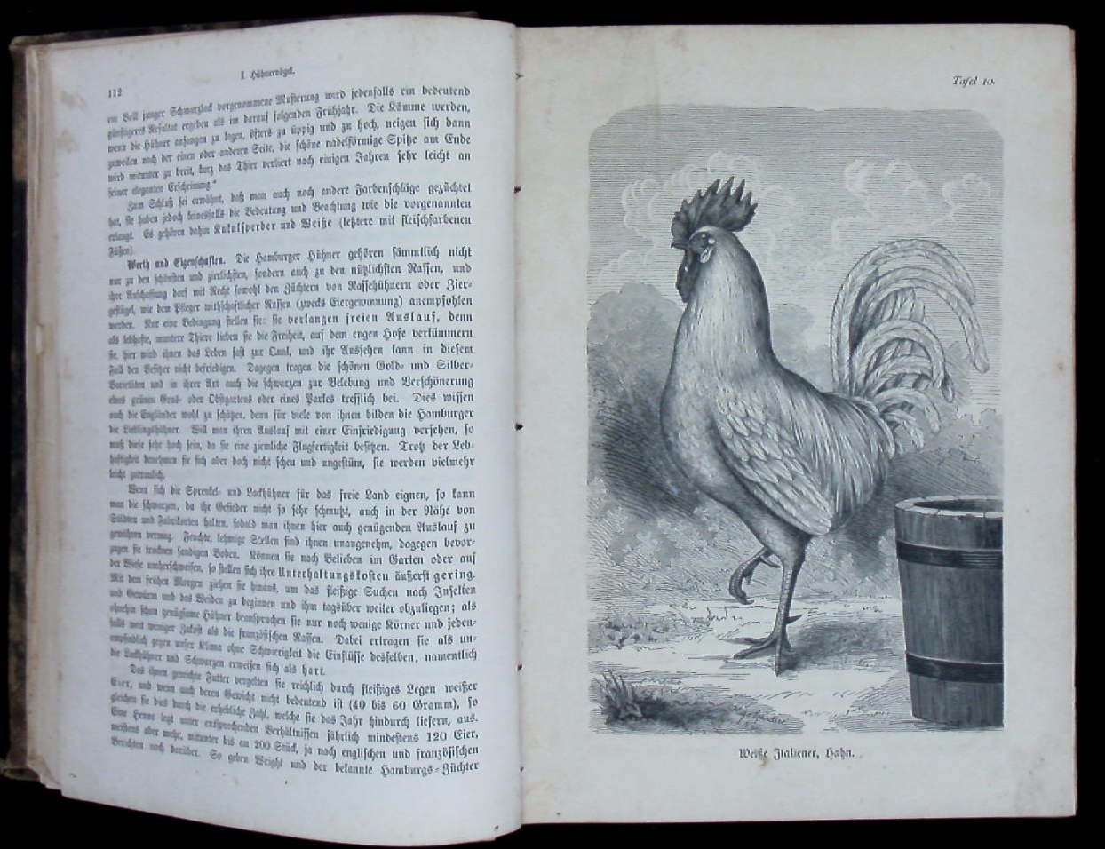 ORNITHOLOGIE.– DÜRIGEN, Bruno: Die Geflügelzucht nach ihrem jetzigen rationellen Standpunkt. Berlin (Parey), 1886. Gr. 8°. S. VI – XIII, 880 S. mit 80 Rassetafeln in Holzschnitt von Hugo Schindler und 101 Textholzstichen. späteres HLn. Titelei fehlt, wenige Seiten mit geringen Randschäden, insgesamt noch gut erhalten. seltene EA des wichtigen Standardwerks mit den eindrucksvollen Tafeln.