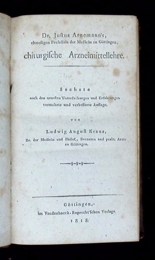 MEDIZIN.– ARNEMANN, Justus: Dr. Justus Arnemann’s … chirurgische Arzneimittellehre. 6 . verbesserte Aufl. von Ludwig August Kraus. Göttingen (Vandenhoek Rupprecht), 1818. XVI, 427 (1) S. Hldr der Zeit mit gerägtem Lederrückenschild. vereinzelt etwas stockfleckig. Justus Arnemann (* 23. Juni 1763 in Lüneburg; † 25. Juli 1806 in Hamburg) war ein deutscher Medizinprofessor und Chirurg. (Wikipedia)