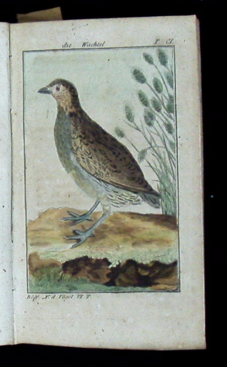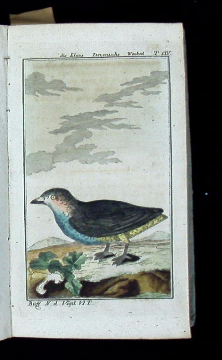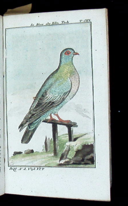TAUBEN.– BUFFON, Georges Louis Leclerc: Naturgeschichte der Vögel. 6. Band: Rebhühner und Tauben. Übersetzt und mit Anmerkungen versehen von Friedrich Heinrich Wilhelm Martini. Brünn (Schrämbl), 1788. kl. 8°. 524 S., + Bl. CXLI – CCI mit 61 fein kolorierten Kupferstichtafeln. Pb der Zeit. oberes Kap. angeplatzt, Titelseite mit Knickspur, die Tafeln komplett und in feinem Kolorit. dt. EA. Anker 78.