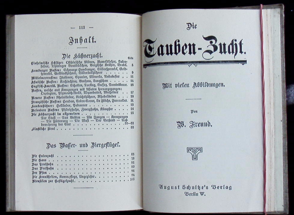 TAUBEN.– FREUND, W.: Geflügelzucht + Die Tauben-Zucht. Eine ausführliche Darstellung der Nutz-Geflügelzucht. Speziell: Hühner, Enten, Gänse, Truthühner, Tauben. Mit Berücksichtigung der künstlichen Brut und der Krankheiten, deren Verhütung und Heilung. 23. Aufl. 2 Bände in 1 Bd. Berlin (Schultze), ca 1920. kl. 8°. 112, 32 S. mit zahlr. Abb. und Bildtafeln. OLn. etwas bestaubt, sonst gut erhalten.