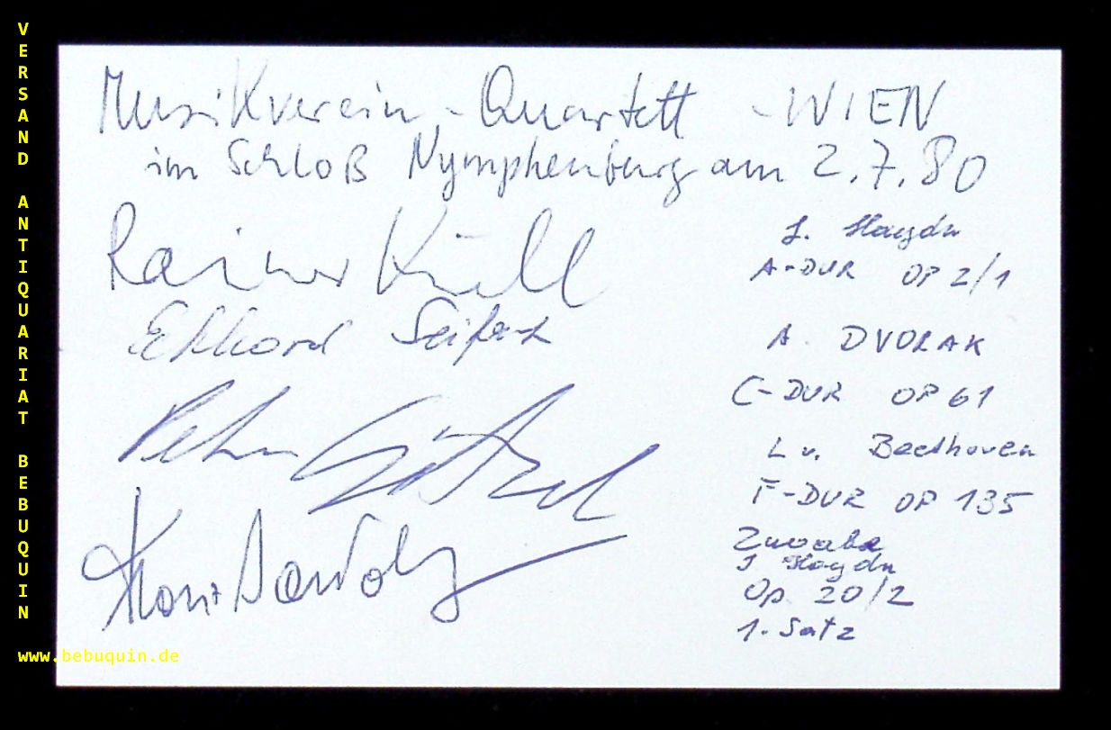 MUSIKVEREIN-QUARTETT.– KÜCHL, Rainer + SEIFERT, Eckhard + GÖTZEL, Peter + BARTOLOMEY, Franz: eigenhändig signierte und datierte Autogrammkarte. München (Herkulessaal), 2.7.1980. 8 x 12,5 cm. Karteikarte. Rainer Küchl (* 25. August 1950 in Waidhofen an der Ybbs) ist ein österreichischer Violinist. (Wikipedia)