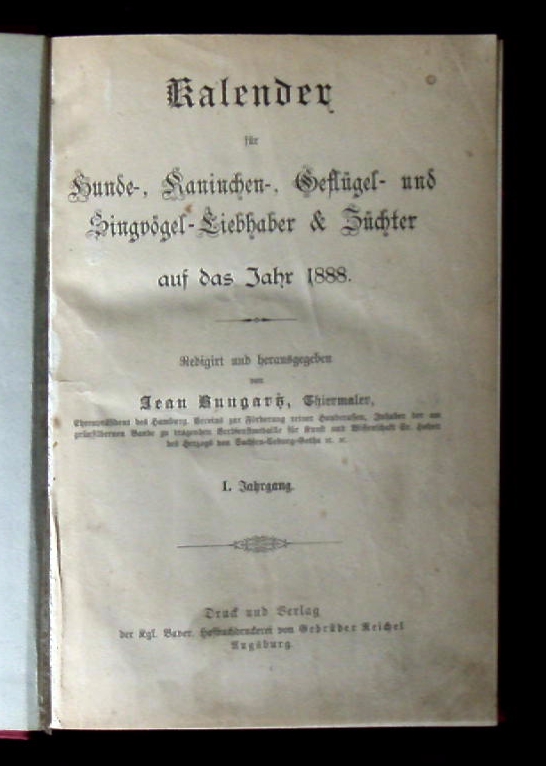 ZOOLOGIE.– BUNGARTZ, Jean: Kalender für Hunde-, Kaninchen-, Geflügel- und Singvögel-Liebhaber & Züchter auf das Jahr 1888.. 1. Jahrgang. Augsburg (Reichel), 1888. 2 Bl. 200 S. (ohne die Seiten 3-28 mit dem Kalender), 69 S. mit Vereinsgerister und 5 Bl.Werbung mit zahlr. Textill. von Jean Bungartz. neuer Leinenband mit aufgesetztem ODeckel. eine Seite mit Eckabriss, ohne den Kalender. sehr seltener und gesuchter Kalen der.