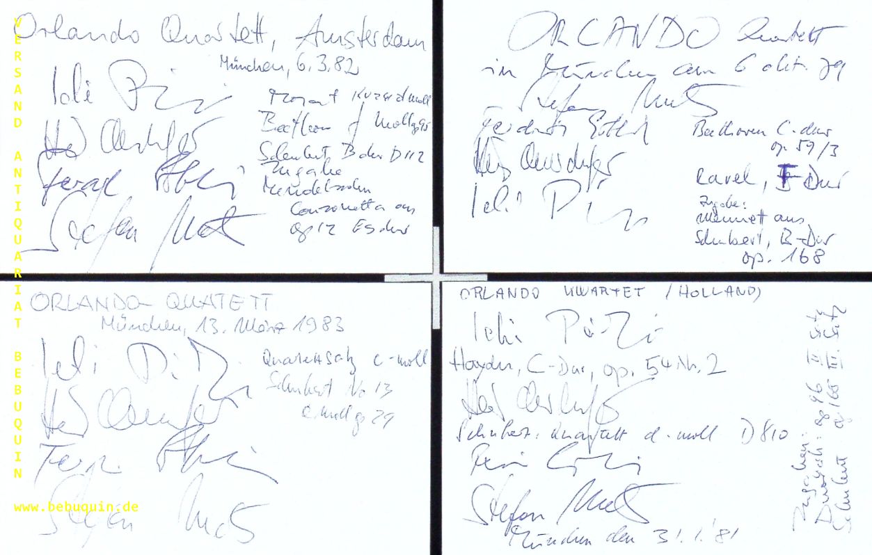 ORLANDO QUARTETT.– PARKANYI, Istvan + OBERNDOEFER, Heinz + ERBLICH, Ferdinand + METZ, Stephan: 4 eigenhändig von allen signierte und datierte Autogrammkarte. München (Schleißheim), 1979 – 1983. 8 x 12,5 cm. Karteikarten. The Orlando Quartet was a classical music string quartet based in Amsterdam, formed in 1976 and active until 1997. (Wikipedia)