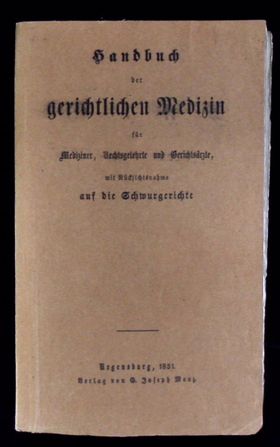 MEDIZIN.– GÜNTNER, Franz X.: Handbuch der gerichtlichen Medizin für Mediziner, Rechtsgelehrte und Gerichtsärzte. Mit Rücksichtnahme auf die Schwurgerichte. Regensburg (Manz), 1851. XX, 472 S. OBr. Kanten unbeschnitten, Titel etwas stockflckig, sonst gut. seltene EA. Güntner studierte Medizin in Prag. 1849 war er Privatdozent für Gerichtsmedizin und 1851 Privatdozent an der juristischen Fakultät. Von 1854 bis 1884 war er Professor für gerichtliche Medizin, Professor für Chirurgie und Augenheilkunde. 1865 wurde er Ehrendoktor der Universität Wien. Er war verheiratet mit Gräfin Wilhelmine Stubick von Königstein. (Wikipedia)