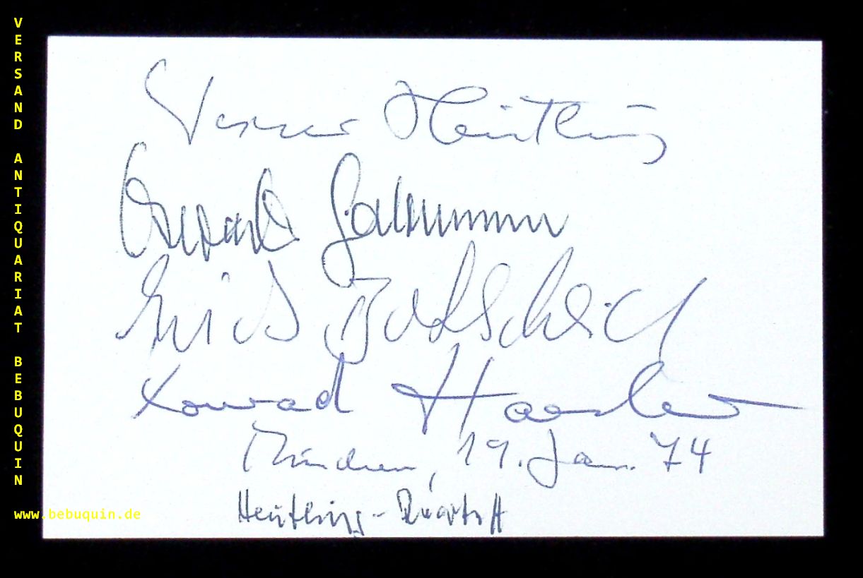 HEUTLING QUARTETT.– HEUTLING, Werner + GATTERMANN, Oswald + BOHLSCHEID, Erich + HAESLER, Konrad: eigenhändig von allen signierte Autogrammkarte. München, 19.1.1974. 8 x 12,5 cm. Karteikarte. Werner Heutling is First violin and founder of Heutling-Quartett, born 6 December 1921 in Aue, Germany and died 6 November 2006 in Hanover, Germany. (Wikipedia)
