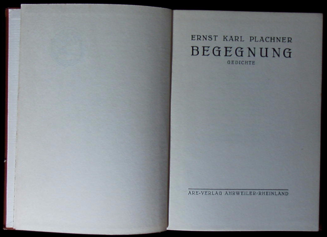 PLACHNER, Ernst Karl: Begegnung. Gedichte. Ahrweiler (Are), 1931. 70 (2) S. OPb. gutes Ex. EA.