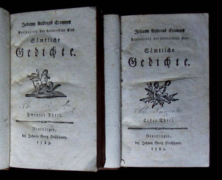 CRAMER, Johann Andreas: Johann Andreas Cramers Prokanzlers der Universität Kiel Sämtliche Gedichte. Theil 1 + 2 (von 3). 2 Bände. Reuttlingen (Fleischhauer), 1783. 8°. 3 Bl., 330, 382 S. Ldr der Zeit mit goldgeprägten Rücken. Kanten berieben, Ex libris auf Innendeckeln Verlagsangabe abweichend von WG² aber wohl zeitgleich mit der EA. (vergl. WG² 15).