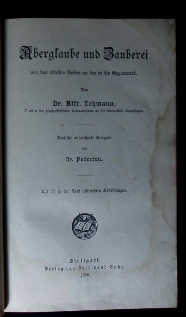LEHMANN, Alfred: Aberglaube und Zauberei von den ältesten Zeiten bis in die Gegenwart. D.v. Petersen. Stuttgart (Enke), 1898. Gr. 8°. XII, 556 S. mit 75 Textabb. HLdr auf 6 Bünden mit goldgeprägtem Rücken. Kanten etwas berieben, anfangs stärker schmutzrandig, verschiedene interessante Bleistiftmarginalien. dt. EA.