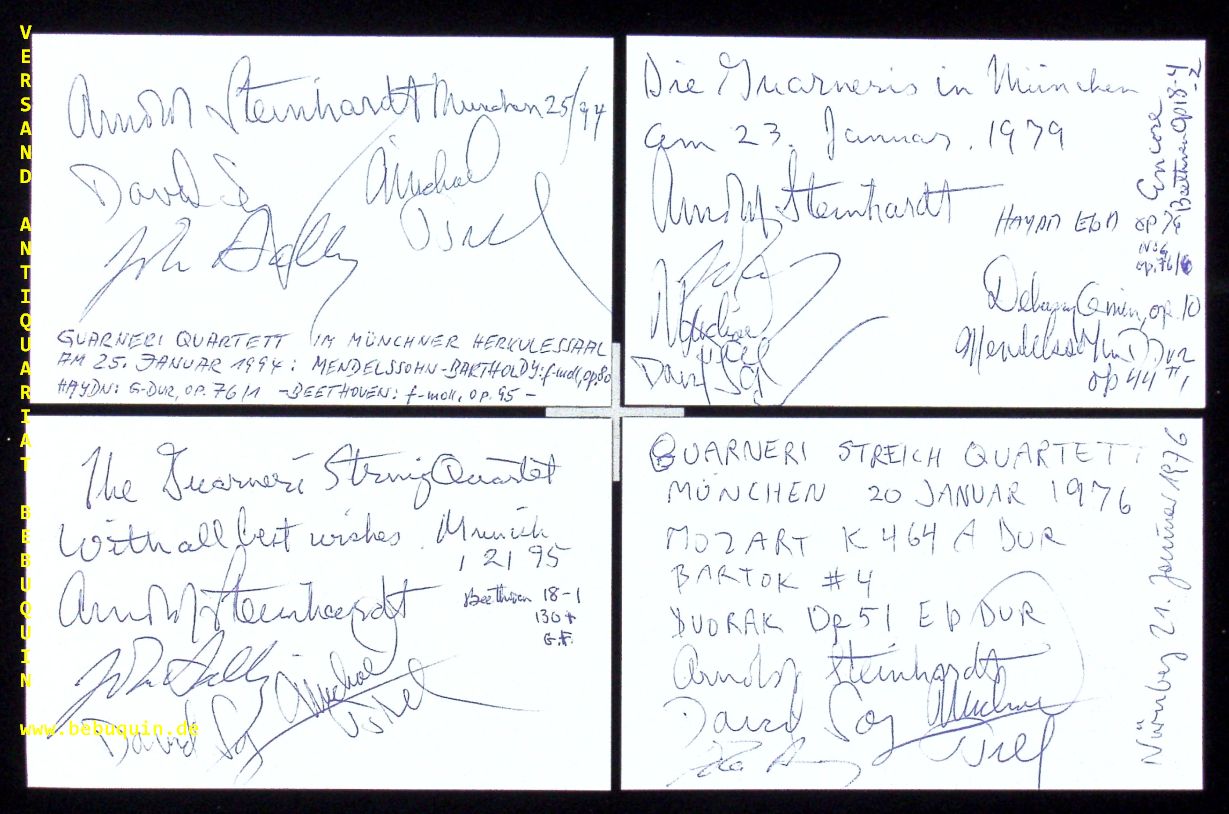 GUARNERI QUARTETT.– STEINHARDT, Arnold + DALLEY, John + TREE, Michael + SOYER, David: 7 eigenhändig von allen signierte und datierte Autogrammkarten. München (Herkulessaal), 1973 – 1979. 8 x 12,5 cm. 7 Karteikarten. Das 1964 gegründete Guarneri String Quartet (auch Guarneri Quartet) ist eines der weltweit bedeutendsten Streichquartett-Ensembles. Es ist in New York beheimatet. (Wikipedia)
