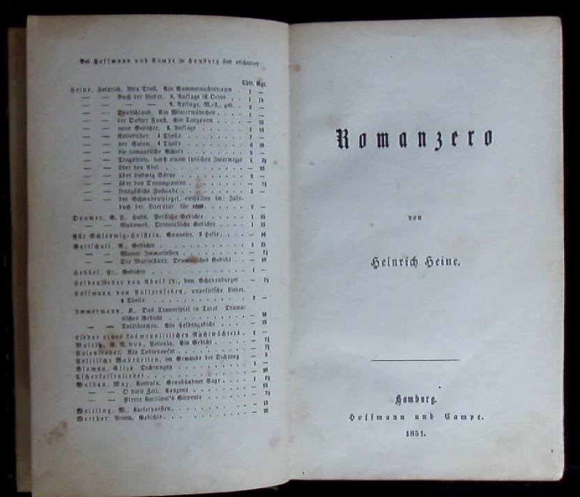 HEINE, Heinrich: Romanzero Hamburg (Hoffmann & Campe), 1851. VI, 314 S. (1 S.) HLn der Zeit mit goldgeprägtem Rücken. etwas schief gelesen, NaV, vereinzelt braunfleckig. = Gedichte, 3. Bd. 2. Druck der EA. Wilhelm / Galley 559. Seltene Ausgabe mit dem Reihentitel, der verso die Verlagsanzeigen enthält, S.127/128 mit der Berichtigung „Spanische Atriden“.