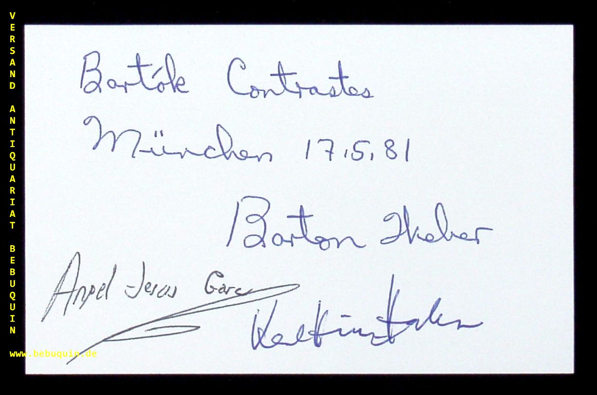 HAHN, Karlheinz (Klarinettist)) + WEBER, Barton (Pianist) + GARCIA, Angel-Jesus (Violinist): eigenhändig von allen drei signierte und datierte Autogrammkarte. München (Herkulessaal), 17.5.1981. 8 x 12,5 cm. Karteikarte.