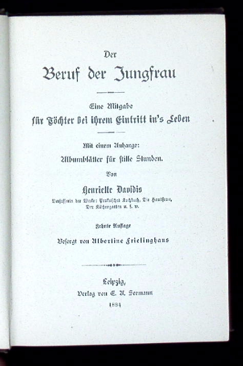 DAVIDIS, Henriette: Der Beruf der Jungfrau. Eine Mitgabe für Töchter bei ihrem Eintritt in’s Leben. Mit einem Anhange: Albumblätter für stille Stunden. 10. Aufl. besorgt von Albertine Frielinghaus. Leipzig (Seemann), 1884. kl. 8°. XVI, 296 S. mit dreiseitigem Goldschnitt reich verzierte OLn. Widmungsseite ausgefüllt, kaum gelockert, schönes Ex.