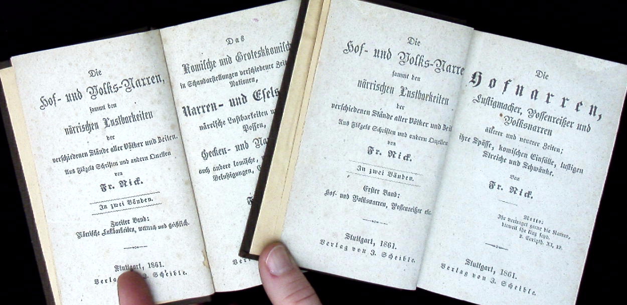 NICK, Friedrich: Die Hof- und Volks-Narren sammt den närrischen Lustbarkeiten der verschiedenen Stände aller Völker und Zeiten. 1. Bd.: Hofnarren, Lustigmacher etc. 2. Bd.: Das Komische und Groteskkomische (…) Narren- und Esels-Feste. 2 Bände. Stuttgart (Scheible), 1861. 12°. XVI, 640, VIII, 855 S. neue Ln mit roten Rückenschildern. gutes Ex. EA. – Hayn-Gotendorf IX, 430. – Das Werk enstand in enger Anlehnung an Carl Friedrich Flögel „Geschichte der Hofnarren“ und versucht eine Systematik des „Närrischen“ zu geben, neben theoretischen Exkursen bringt es auch eine Aufgliederung nach Nationen und Ständen. – Bd. 1: „Die Hofnarren, Lustigmacher, Possenreißer und Volksnarren älterer und neuerer Zeiten; ihre Spässe, komischen Einfälle, lustigen Streiche und Schwänke“. Bd. 2: „Das Komische und Groteskkomische in Schaudarstellungen verschiedener Zeiten und Nationen, Narren- und Esels-Feste, närrische Lustbarkeiten und lustige Possen, Gecken- und Narren-Orden, auch andere komische, weltliche und kirchliche Belustigungen, Curiositäten u. s. w. (Truppe)