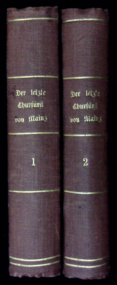 STEIN, Paul: Der letzte Churfürst von Mainz. historischer Roman aus dem Ende des vorigen Jahrhunderts. 2. Ausgabe. 3 Bände in 2 Bänden. Leipzig (Grunow), 1860. 304, 288, 272, 255 S. HLn der Zeit mit goldgeprägten Rücken. gutes Ex. Angebunden / Carl von Kessel: Schlewig-Holstein meerumschlungen von 1866.