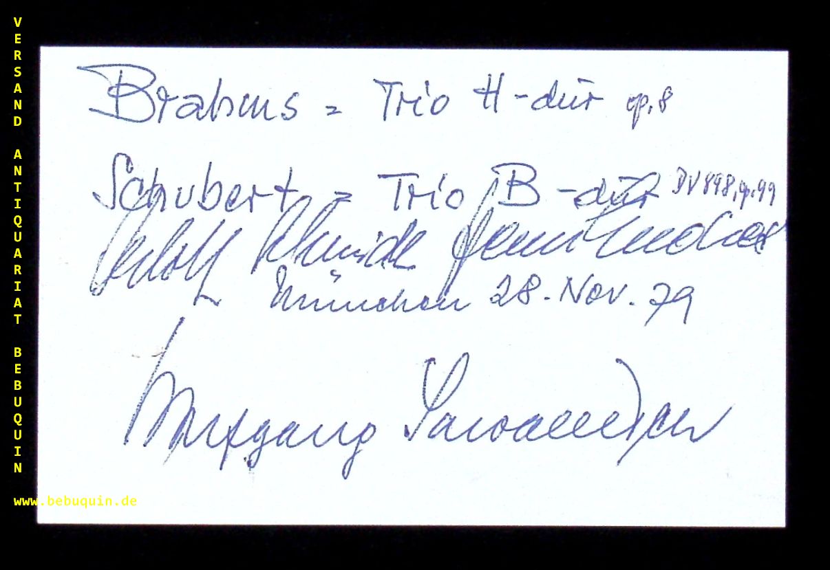SAWALLISCH, Wolfgang (Pianist) + ENDRES, Heinz (Violinist) + SCHMIDT, Adolf (Cellist): eigenhändig von allen signierte und datierte Autogrammkarte. München, 23.1.1980. 8 x 12,5 cm. Karteikarte. Wolfgang Sawallisch (* 26. August 1923 in München; † 22. Februar 2013 in Grassau) war ein deutscher Dirigent und Pianist. (Wikipedia)
