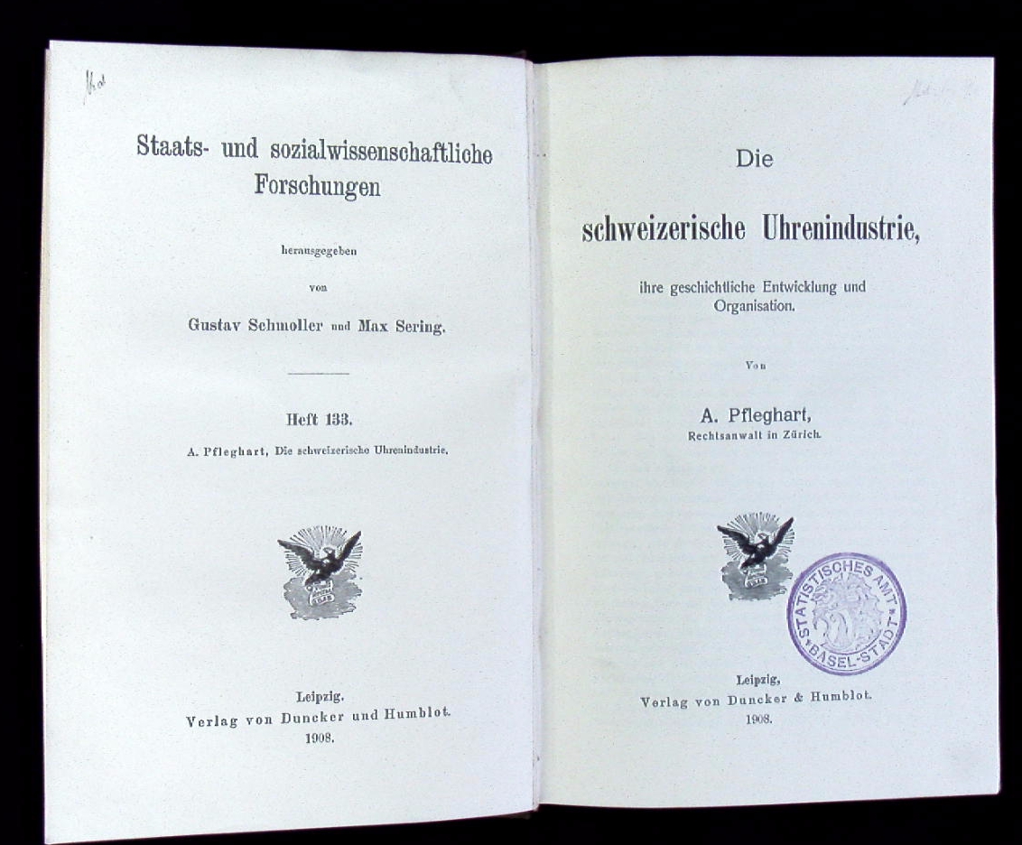 UHREN.– PFLEGHART, Adolf: Die schweizerische Uhrenindustrie, ihre geschichtliche Entwicklung und Organisation. Ihre geschichtliche Entwicklung und Organisation. Leipzig (Duncker & Humblot), 1908. XII, 203 S. Tab. HLn der Zeit. makuliertes Bibl. Ex., wenige Bleistiftunterstreichungen. = Staats- und sozialwissenschaftliche Forschungen, 133. seltene EA.
