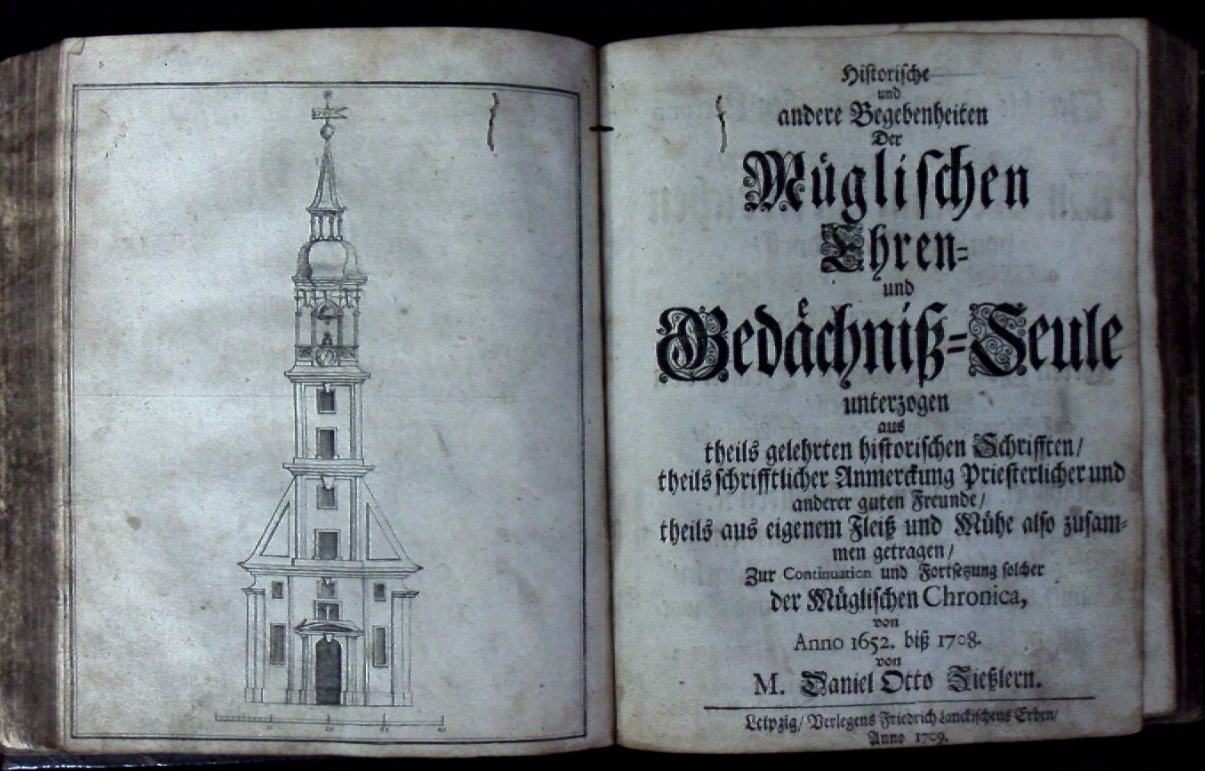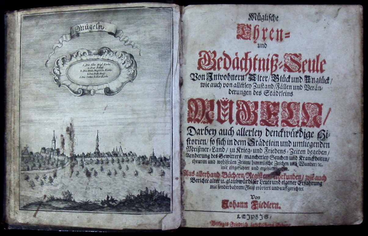 Bemmann-Jatzwauk III/2, 47. – Zweite Ausgabe der Fiedlerschen Chronik von Mügeln, die zuerst 1652 erschienen war. Hier mit einer Fortsetzung von Daniel Otto Zießler (1666-1724) versehen, die mit eigenem Titelblatt angefügt ist: “Historische und andere Begebenheiten der Müglischen Ehren- und Gedächtniß-Seule […] zusammen getragen, zur Continuation und Fortsetzung solcher der Müglischen Chronica, von Anno 1652. biß 1708.” – Johann Fiedler (1612-1672), Theologe und Poet aus Reichenbach im Vogtland, war von 1638 bis 1658 Diakon in Mügeln. – Das erste Frontispiz mit einer Gesamtansicht von Mügeln.
