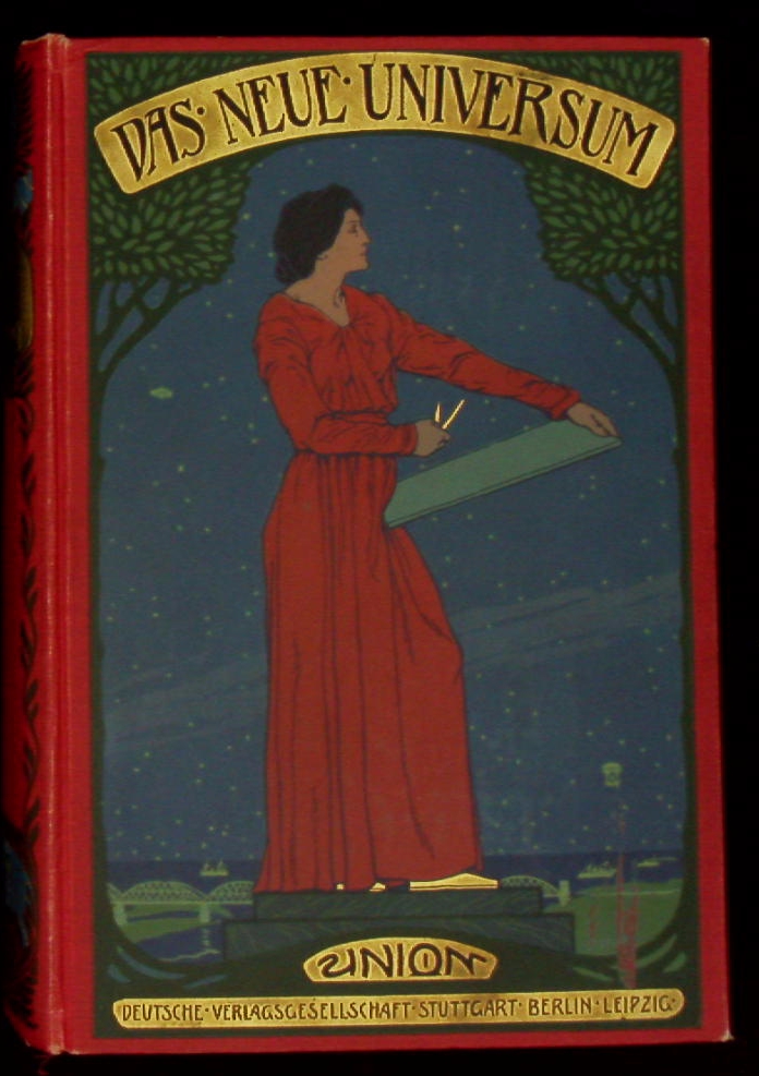 DAS NEUE UNIVERSUM. Die interessantesten Erfindungen und Entdeckungen auf allen Gebieten, sowie Reiseschilderungen, Erzählungen, Jagden und Abenteuer. Stuttgart (Union), (1906). VI, 473 (5) S. mit sehr zahlr. z.T. farb. Abb. im Text + auf Tafeln sowie der gefalteten Titeltafel mit dem neuen Zentralbahnhof Hamburg. ill. OLn. feines Ex. = Bd. 27. Das Neue Universum war eine Jugendbuchreihe. Ab 1880 erschien jährlich ein Band mit Themen aus den Bereichen Wissen, Forschung, Abenteuer, Unterhaltung. In den Jahren 1943 sowie 1945 bis 1947 wurden keine Bände veröffentlicht. 1958 erschien der Jubiläumsband 75. Im Jahr 2002 erschien nach 122 Jahren der letzte Band mit Nummer 119. Die Bände 1 bis 11 erschienen im W. Spemann Verlag, Stuttgart; die Bände 12 bis 90 im Union Verlag Deutsche Verlagsgesellschaft, Stuttgart-Berlin-Leipzig; die Bände 91 bis 119 im Südwest-Verlag, München. Außer Sachthemen druckte das Neue Universum auch fiktionale Texte. Bekannte Autoren wie Isaac Asimov und Hans Dominik und viele andere veröffentlichten so ihre Science-Fiction-Kurzgeschichten im Neuen Universum. Dabei zeichnen sich Themenwahl und inhaltliche Gestaltung durch einen starken Zukunfts-, Wissenschafts- und Machbarkeitsoptimismus aus. In den Jugendstilbänden hieß es im Untertitel: Ein Jahrbuch für Haus und Familie, besonders für die reifere Jugend, mit einem Anhang zur Selbstbeschäftigung „häusliche Werkstatt“. Später lautete der Untertitel des Jahrbuches „Ein Jahrbuch des Wissens und Fortschritts“, ab 1970 wurde es umbenannt in „Forschung, Wissen, Unterhaltung. Ein Jahrbuch“, ab 1985 hieß es „Ein Jahrbuch für Forschung, Wissen, Unterhaltung“. (Wikepedia)