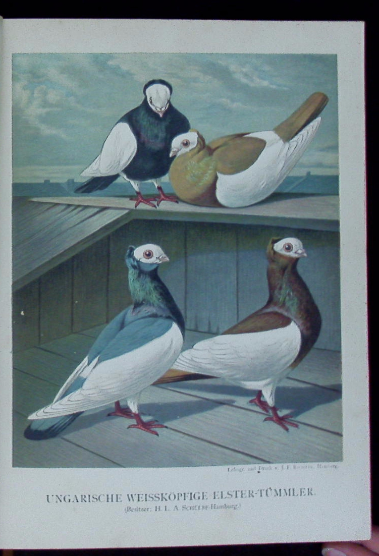 TAUBEN.– PRÜTZ, Gustav: (Hrsg.) Illustrirtes Mustertauben-Buch. Enthaltend das Gesammte der Taubenzucht. 2 Bände. Hamburg (Richter), (1886). 4°. XVII, 438 S. mit 81 Pracht – Farbendruck – Bildern von Christian Förster und 40 Original Text – Illustrationen und dreiseitigem Rotschnitt.. HLdr. der Zeit mit goldgeprägtem Rücken. Kanten etwas berieben, Rücken geblichen, NaT, insgesamt gutes Ex. EA. Niessen, 746/Möbes, S. 126 schreibt: Im Format (21 cm x 27 cm) das größte Taubenbuch, welches je veröffentlicht wurde. Mit einem hervorragenden Beitrag über die Huhntauben von Freiherr von Washington auf Schloß Porls in der Steiermark. Der Tiermaler Christian Förster hat die Bilder für dieses Prachtwerk geschaffen und sich damit als einer der befähigsten Künstler auf diesem Gebiet gezeigt, der in dem der Natur abgesehenen Leben, das aus seinen Taubengemälden strahlt, m.E. zeitweilig den berühmten Geflügelmaler Ludlow übertraf. Eine absolute Rarität.