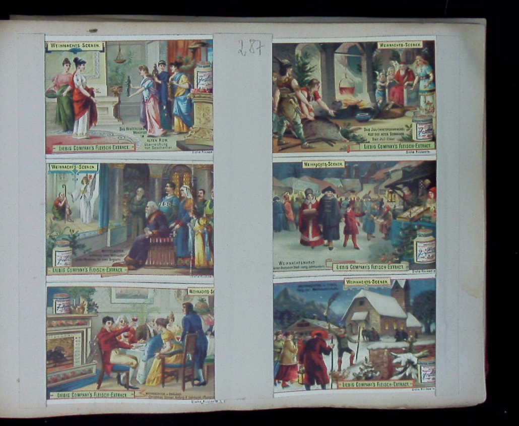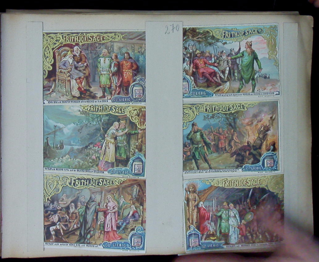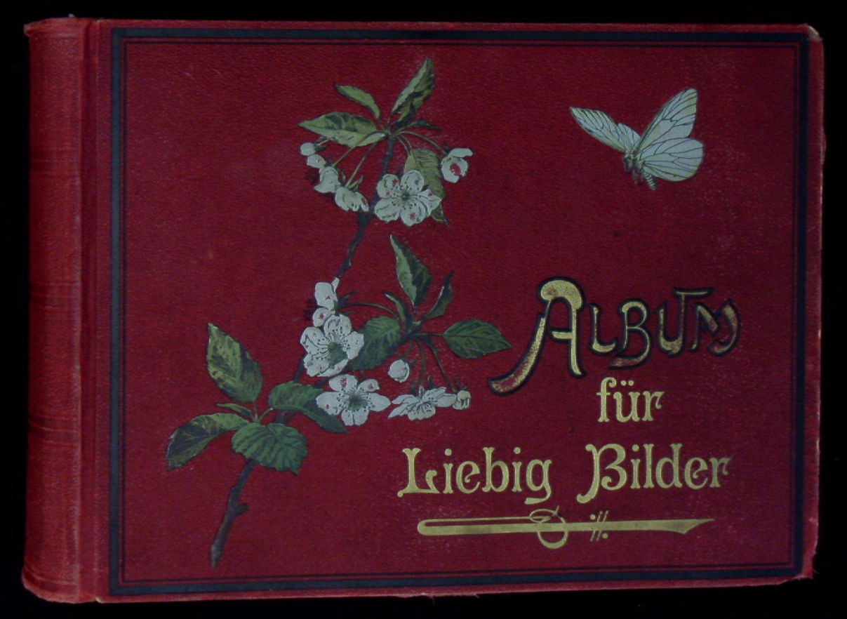 SAMMELBILDERALBEN.– LIEBIG.– Album mit Sammelbildern. Hamburg, (Liebig Company’s Fleisch-Extract), ca 1890 – 1920. Quer 4°. 68 Serien mit über 400 farb. Sammelbildern. Original Leinenalbum mit relativ seltener farbiger Einbandgestaltung mit Blume und Schmetterling. Album in ordentlicher Außenerhaltung, innen mit Streifenfixierung leicht wellig. Die Bilder überwiegend von guter Erhaltung mit einigen Beigaben. Folgende Serien sind vorhanden: 256, 341 (22,–), 247 (35,–), 317, 292 (25,–), 735, 244 (20,–), 304, 332, 260 (60,–), 270, 250, 313, 343, 342, 314 (45,–), 287, 315, 382 (25,–), 307 (1), 267 (20,–), 349, 328, 180 (40,–), 246, 461, 275 (20,–), 214 (4,5,6), 245 (1,3,4), 311, 398, 380, 302 (85,–), 319, 296, 327, 303, 277, 431, 232 (30,–), 345, 383 (20,–), 251 (25,–), 415, 280 (45,–), 190 (3), 369 (2), 184 (20,–), 249, 325, 295, 274 (25,–), 417, 286, 385, 194 (40,–), 201 (40,–), 334 (25,–), 282, 252 (22,–), 374, 362, 241 (25,–), 321, 276 (30,–), 254 (30,–), 348, 569, 728, 701, 731 (22,–) (In Klammern sind die jeweils fehlenden Bilder aufgeführt bzw. die Preise laut Liste).