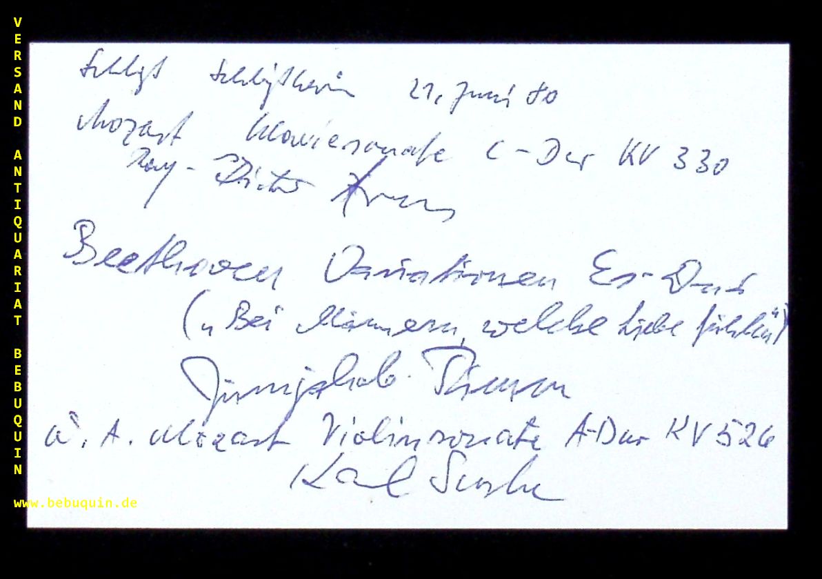 GEWANDHAUS QUARTETT.– SUSKE, Karl + ARENS, Rolf-Dieter + TIMM, Jürnjakob. eigenhändig signierte und datierte Autogrammkarte. Dachau (Schloß), 21.6.1980.. 8 x 12,5 cm. Karteikarte.