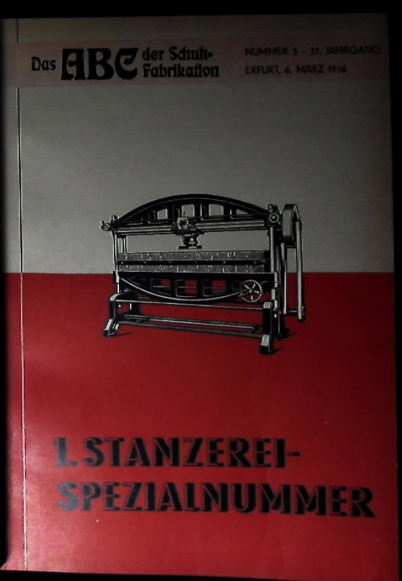 MODE.– DAS ABC DER SCHUH-FABRIKATION 1936.– 7 Hefte der Fachzeitschrift für Schuhfabrikanten: Nr. 5, 7, 9, 10, 11, 12, 13. Erfurt (Hugo Seiler), 1936. 4°. ca 400 S. mit zahlr. Abb. + zahlr. gediegene Farbtafeln mit Designerschuhe. HLdr der Zeit. sehr gutes Ex. = 1. Halbjahr 1936 mit Inhaltsverzeichnis. absolut rares Schuhwerk mit folgenden Hefttiteln: 1.+ 2. Stanzerei-Spezialnummer + Die Bodenbestandteil-Zurichterei + Spezialnummer der Absatzbau etc.