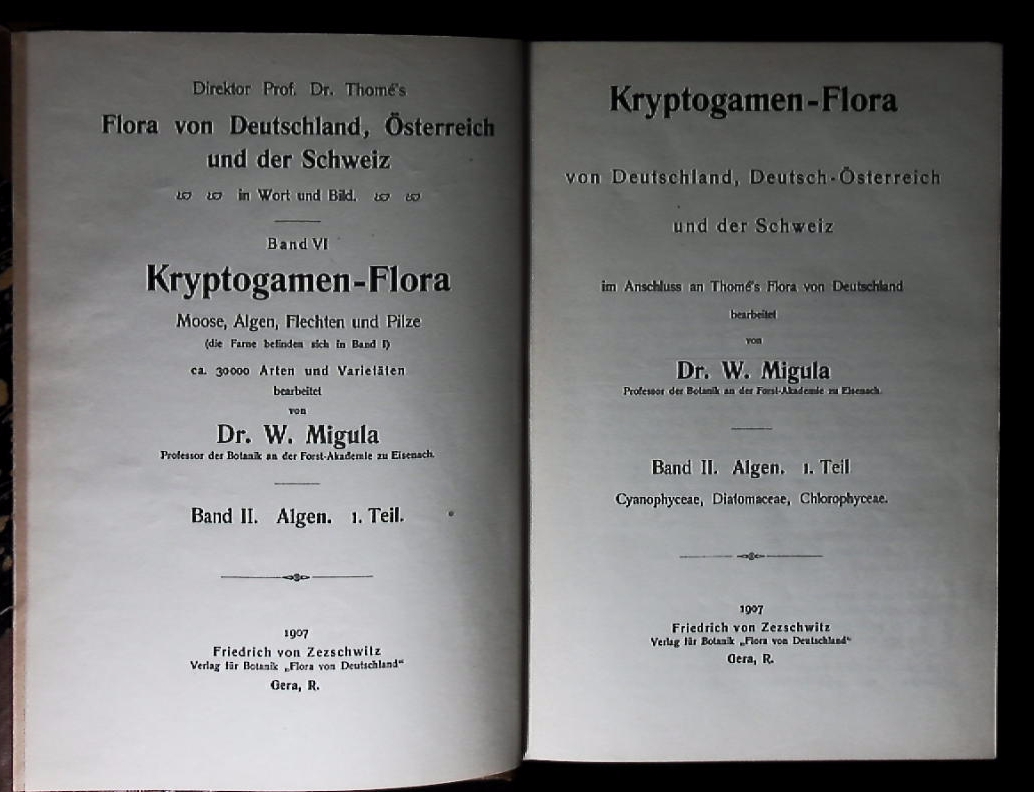 BIOLOGIE.– MIGULA, W.: Krytogamen-Flora von Deutschland, Deutsch-Österreich und der Schweiz. Bd. II Algen, 1. Teil: Cyanophyceae, Diatomaceae, Chlorophyceae. 2. Teil: Rhodophyceae, Phaeophyceae Characeae. 2 Teile in 3 Bänden. Gera, (Friedrich von Zezschwitz), 1907. (4), 918 S.; (4), 383 S. Mit 287 zum Teil farbigen Tafeln. OHLn mit jeweils 2 goldgeprägten farb. Rückenschildern. Rücksnchildern gering berieben, sehr gute Erhaltung. = Thome’s Flora von Deutschland, Österreich und der Schweiz in Wort und Bild. EA.